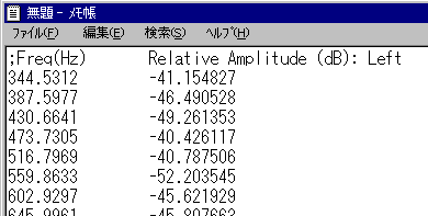 この機能はマウス右クリックメニューに提供されています。グラフ全体あるいは指定範囲のデータをコピーアンドペーストして、ワープロや表計算ソフト等で利用することができます。周波数データとレベルデータはタブセパレータで分離されています。